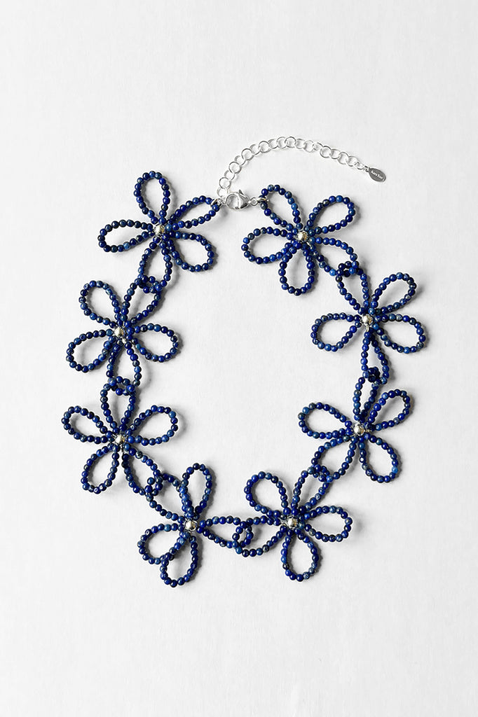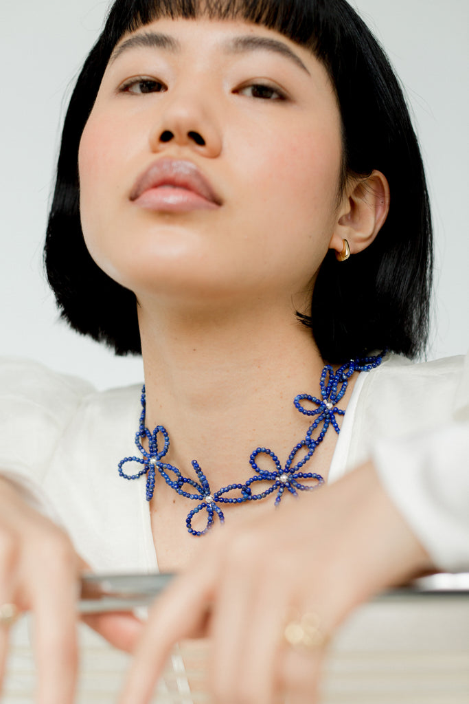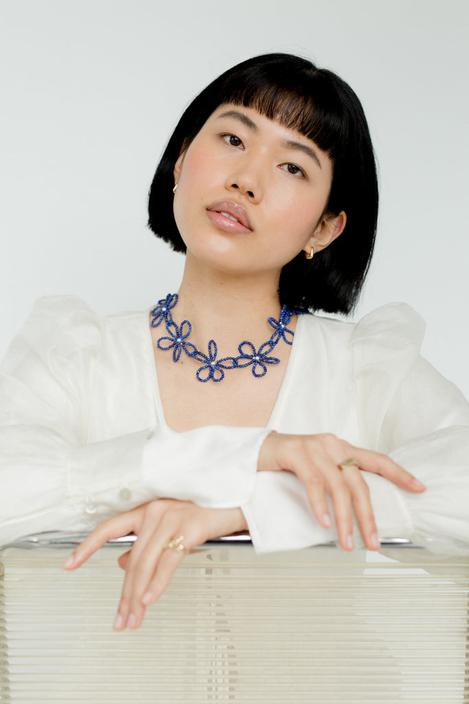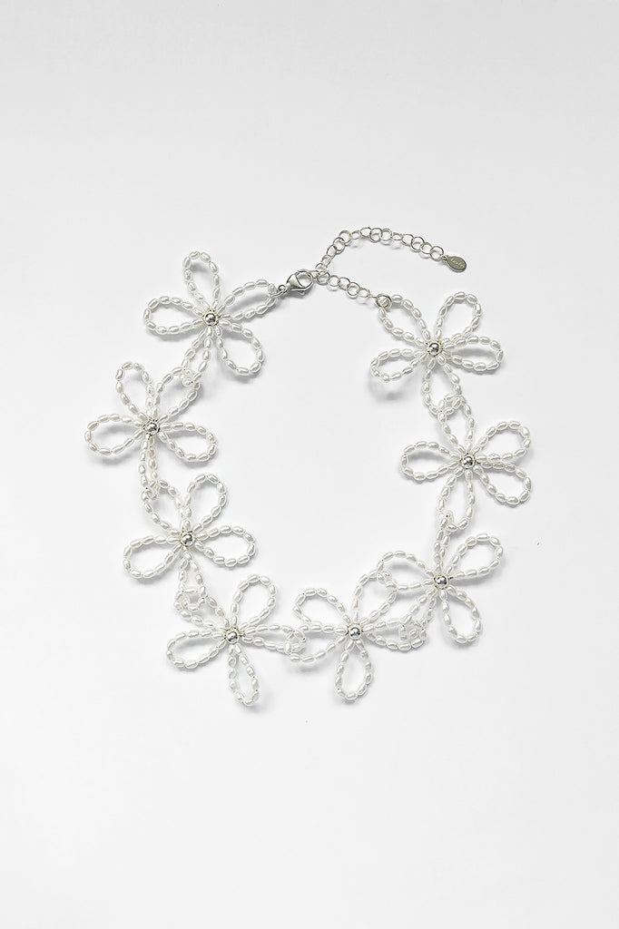 A necklace of intertwining, hand-beaded flowers. Emulating 90's style chokers, the Bloom Necklace is a delicate statement piece.