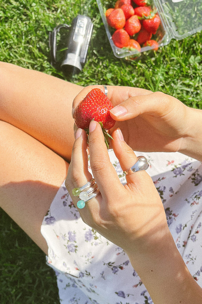 An angular knife-edge ring with smoothed curves culminating in a natural gemstone bubble. It has a consistent width band to allow for stacking multiple.