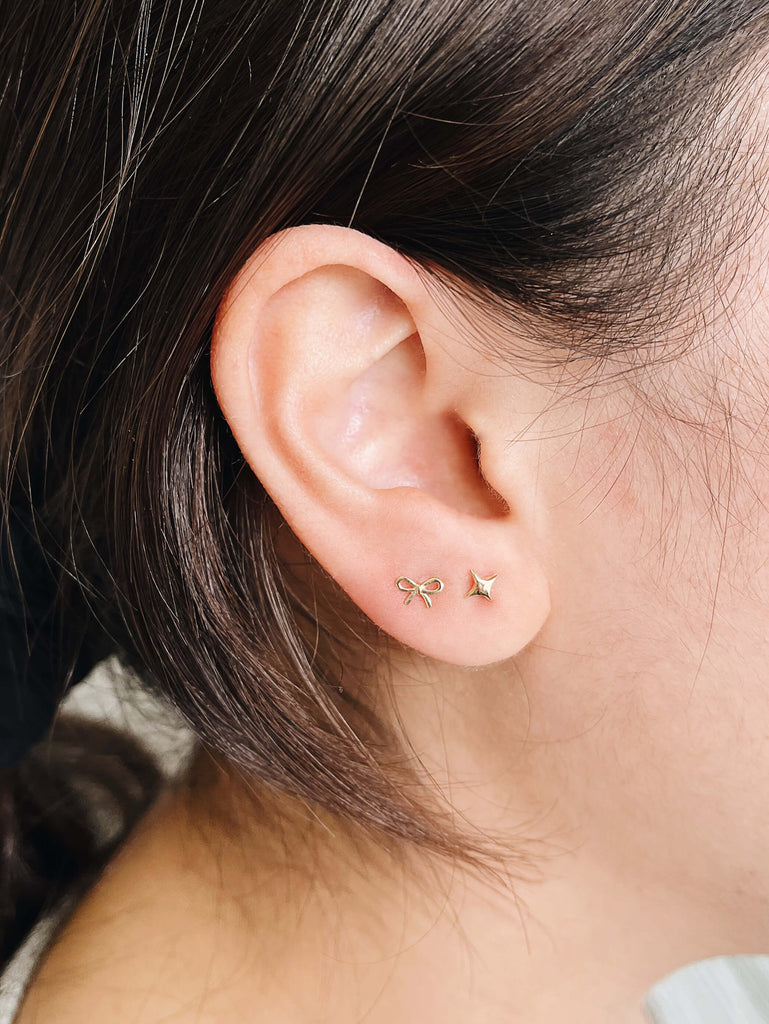 A dainty bow-shaped stud, especially great as part of an ear stack with other studs, and go really well with pearls.