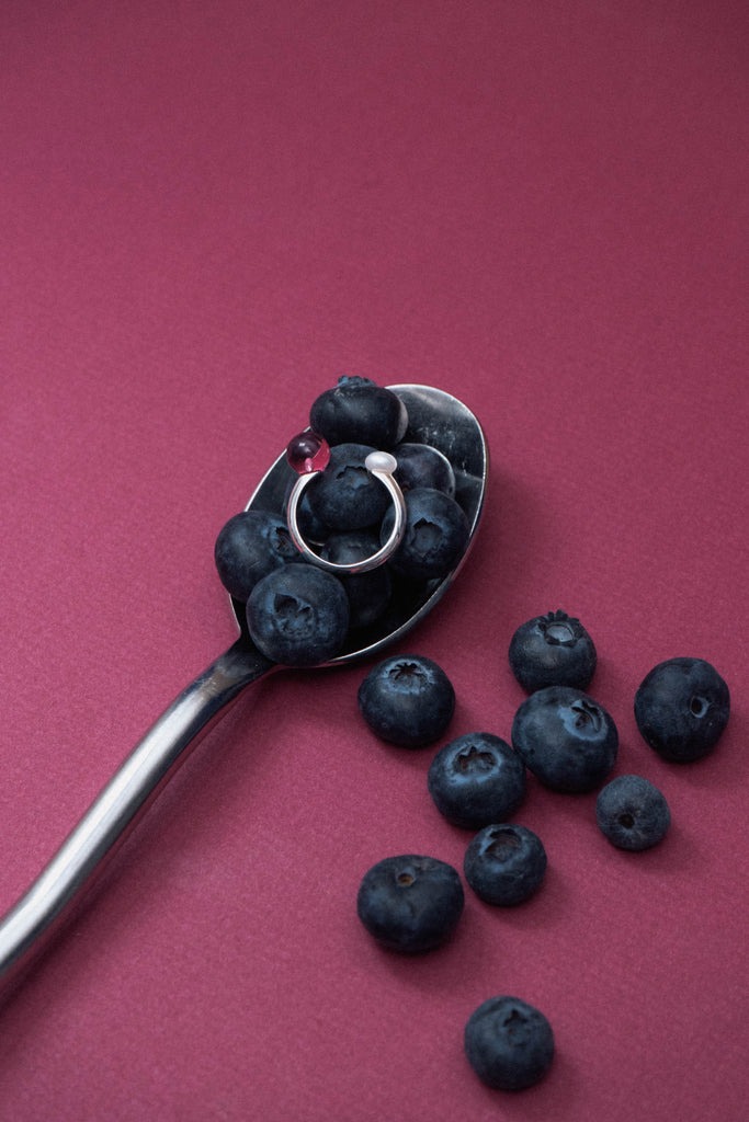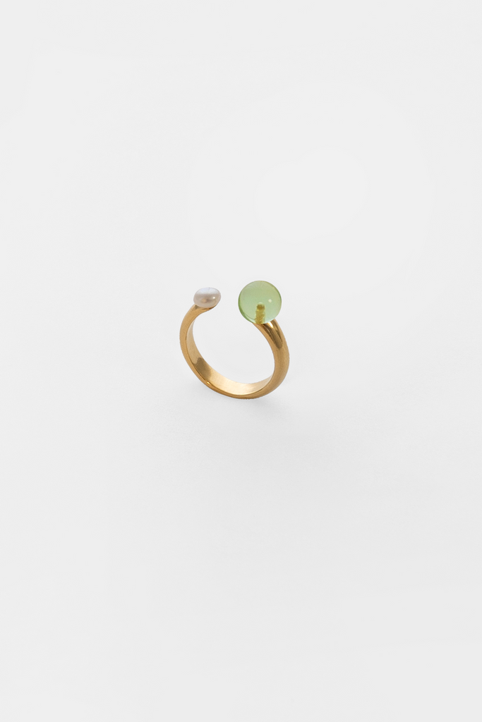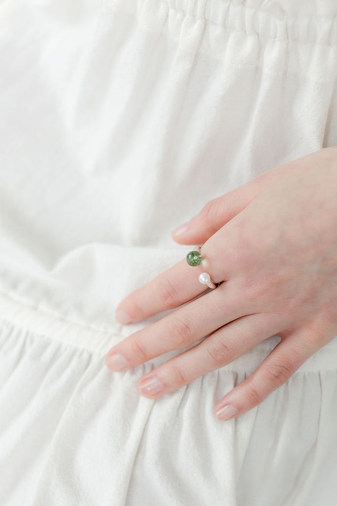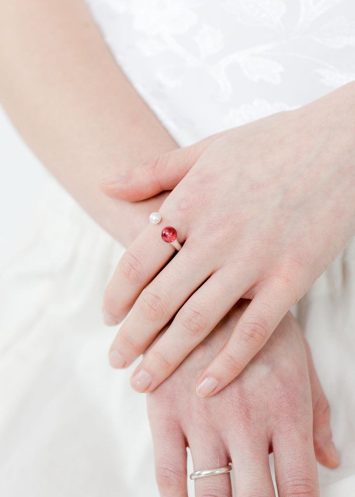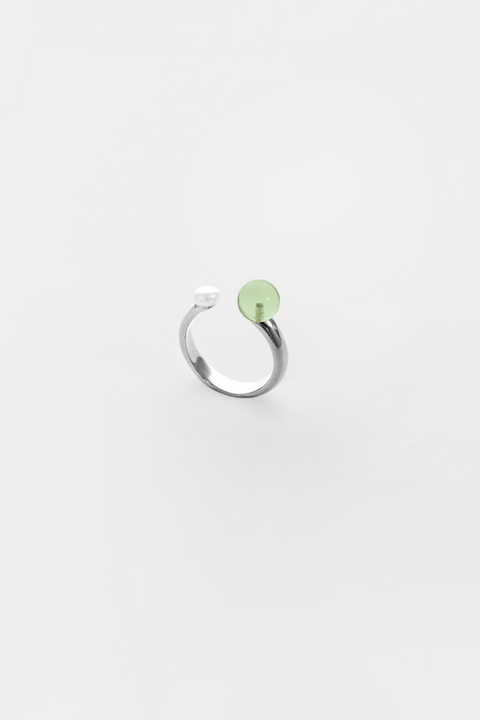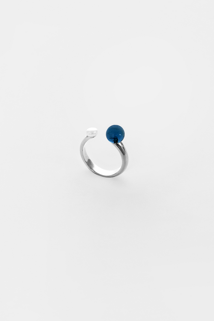 A simple open ring with a smooth glass sphere paired with a slightly organic shaped button pearl.