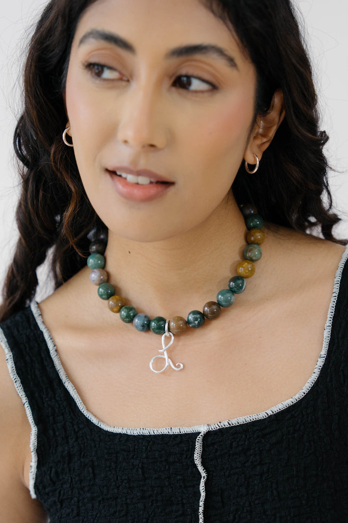 An oversized collar necklace made from natural, earthy-toned agate beads.