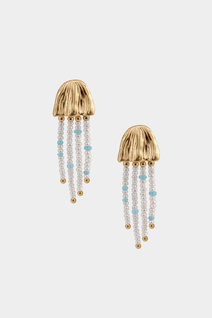 Organic shaped white freshwater pearls and iridescent creamy light blue Ethiopian opal dangle freely from a jellyfish, creating movement when wearing.